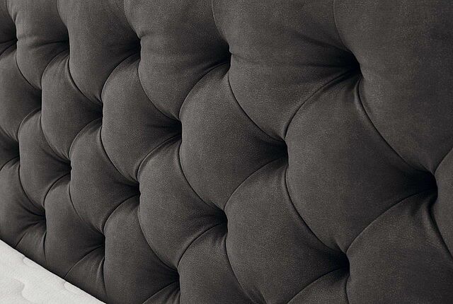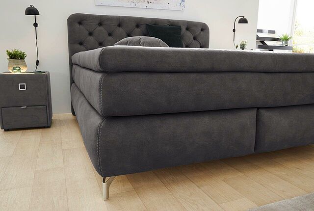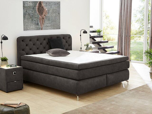 Boxspringbett Marilyn Max mit modernem Mikrofaserbezug in anthrazit, Box mit Bonnell-Federkern, 2 x 7-Zonen-Tonnentaschen-Federkernmatratzen fest/hart, inkl. extra starkem Kaltschaum-Topper, Füße chromfarbig, Liegefläche ca. 180 x 200 cm.