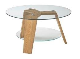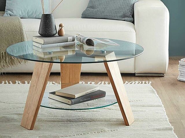 Eleganter Couchtisch Lublin rund, Top und Ablage Klarglas, Beine Asteiche massiv geölt, bis max. 10 kg belastbar, B/H/T ca. 75 x 40 x 75 cm.