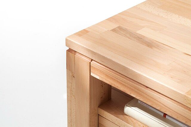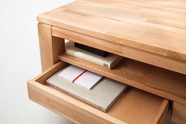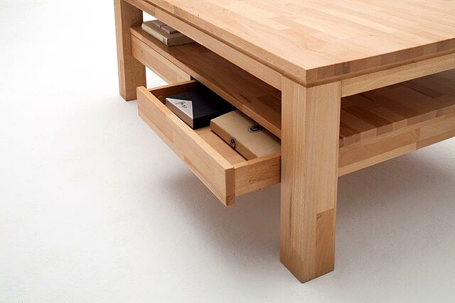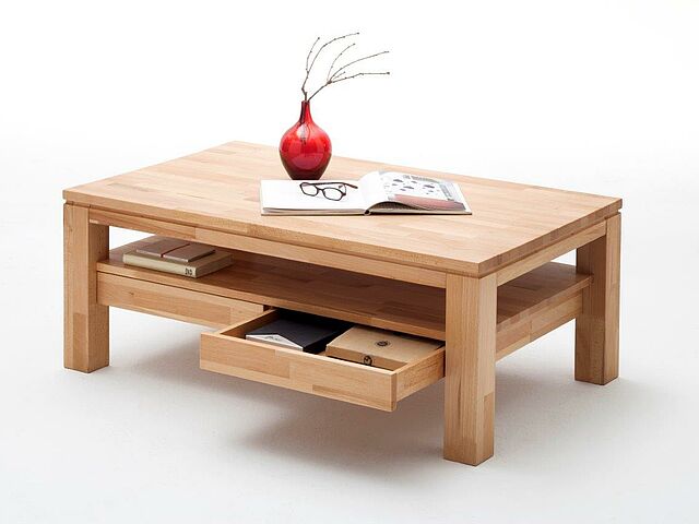Couchtisch Gordan, Kernbuche massiv geölt, 2 Schubkästen, B/H/T ca. 115 x 45 x 70 cm. Ohne Dekoration.